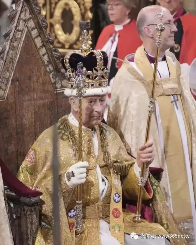 11时,加冕仪式正式开始,持续约1小时。其间,查尔斯三世被授予君主权杖和王室宝球,并戴上纯金打造的17世纪圣爱德华王冠。这顶王冠高30多厘米、重2.23公斤,仅在加冕时使用。