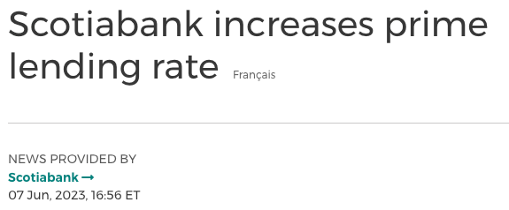加拿大各大主要商业银行,包括RBC 皇家银行、CIBC、BMO 银行和TD道明银行很快就跟随,宣布从今天周四起,将他们贷款基准利率PRIME上调 25 个基点至 6.95%。