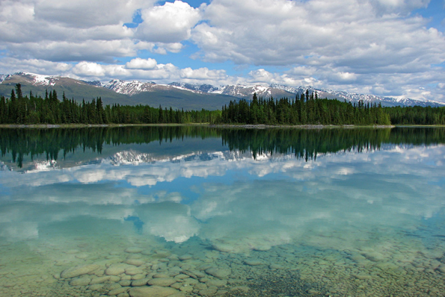 坐落在BC省和育空地区的边界以南约75公里处的博亚湖省立公园,蓝绿色的湖水映照着连绵的凯瑟山脉。