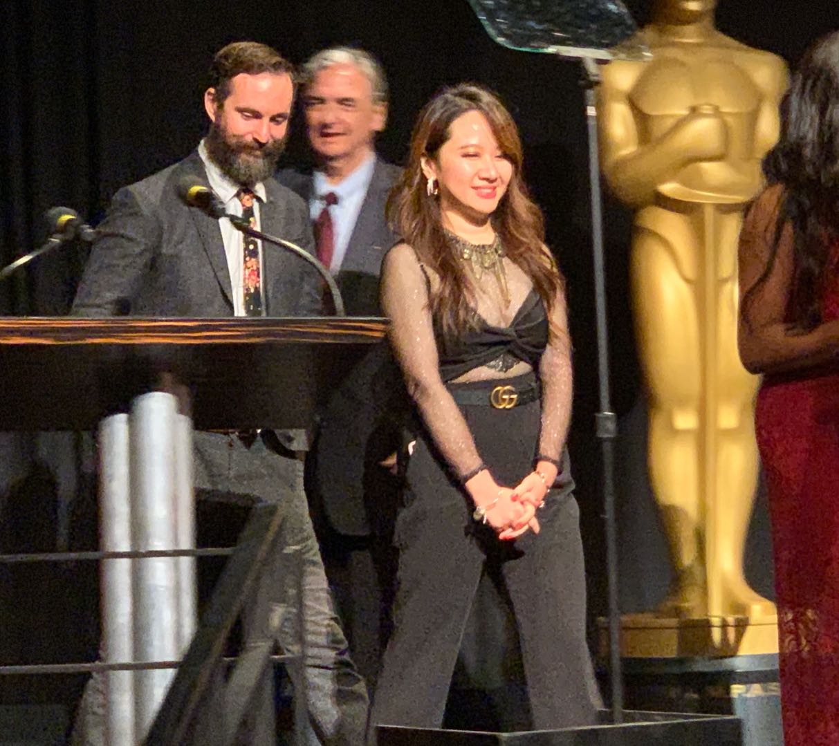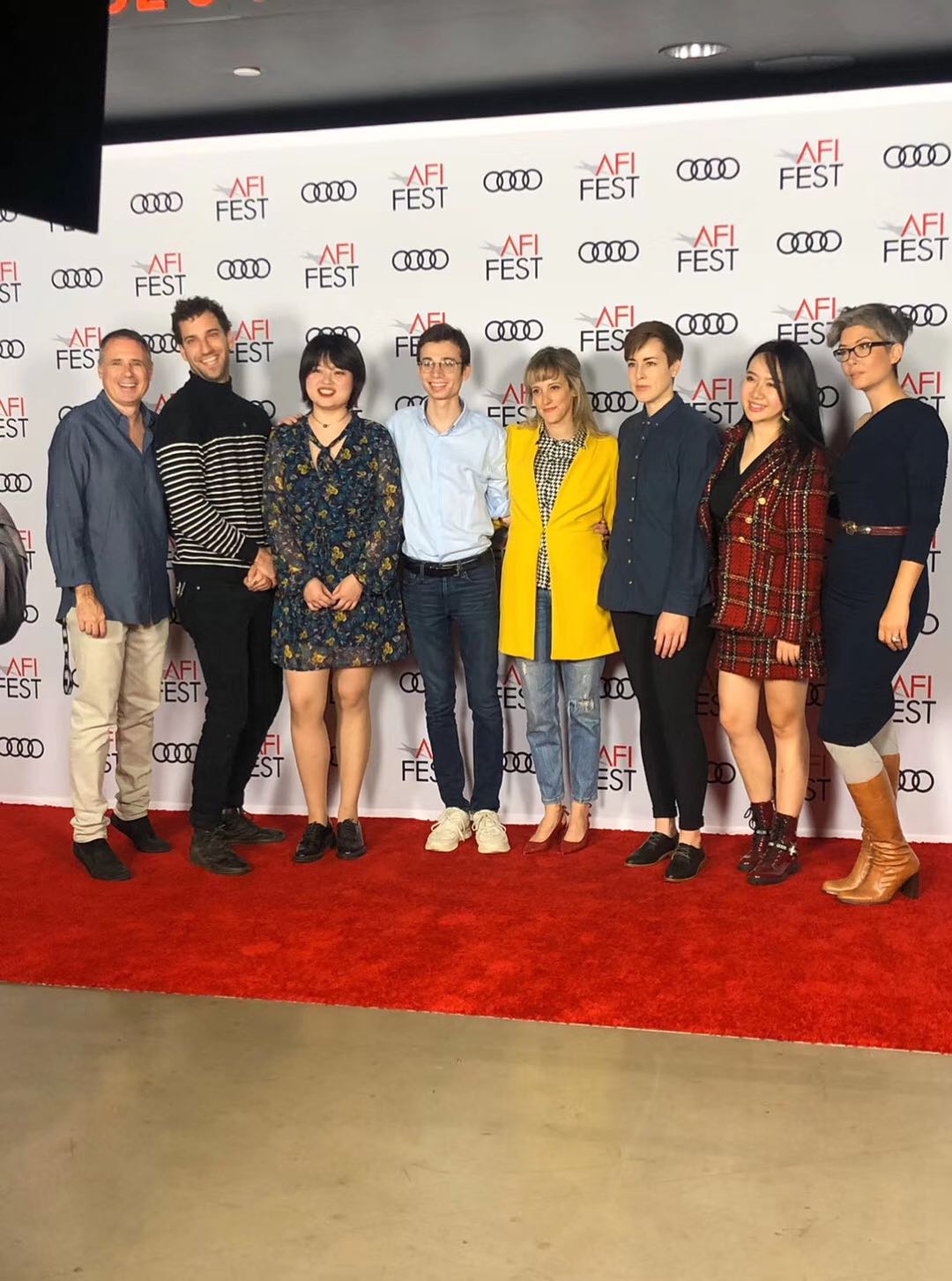 美國國家电影學會,一年一度的國際电影節開幕式上,周天嬌子(右二)與獲奬的團隊在一起。