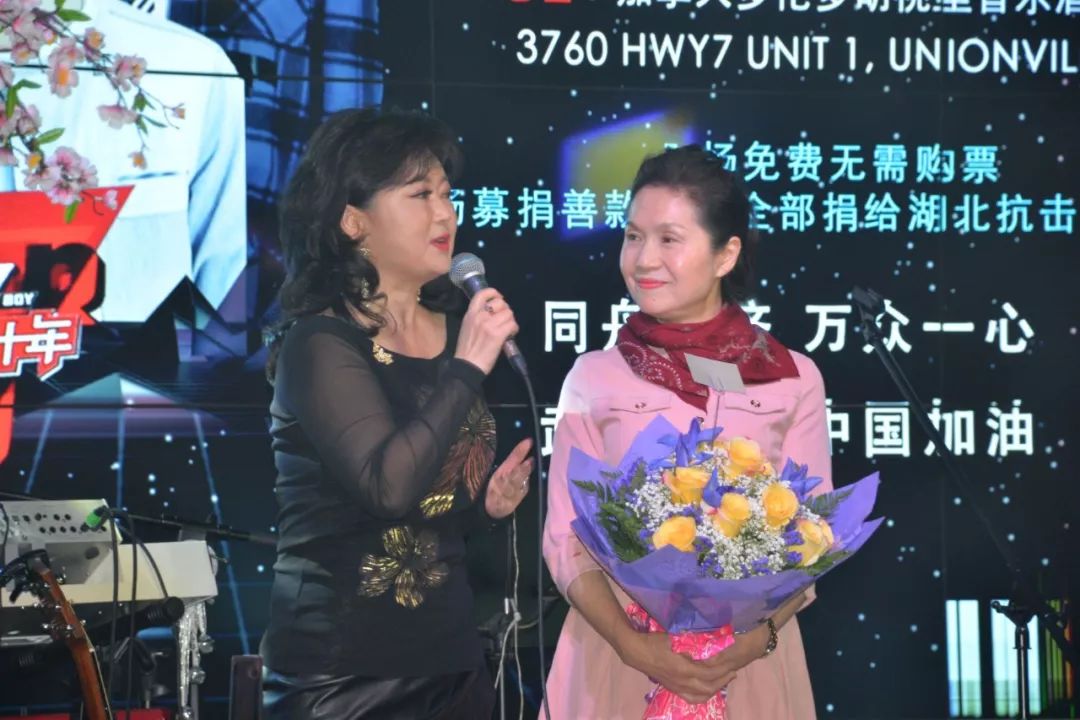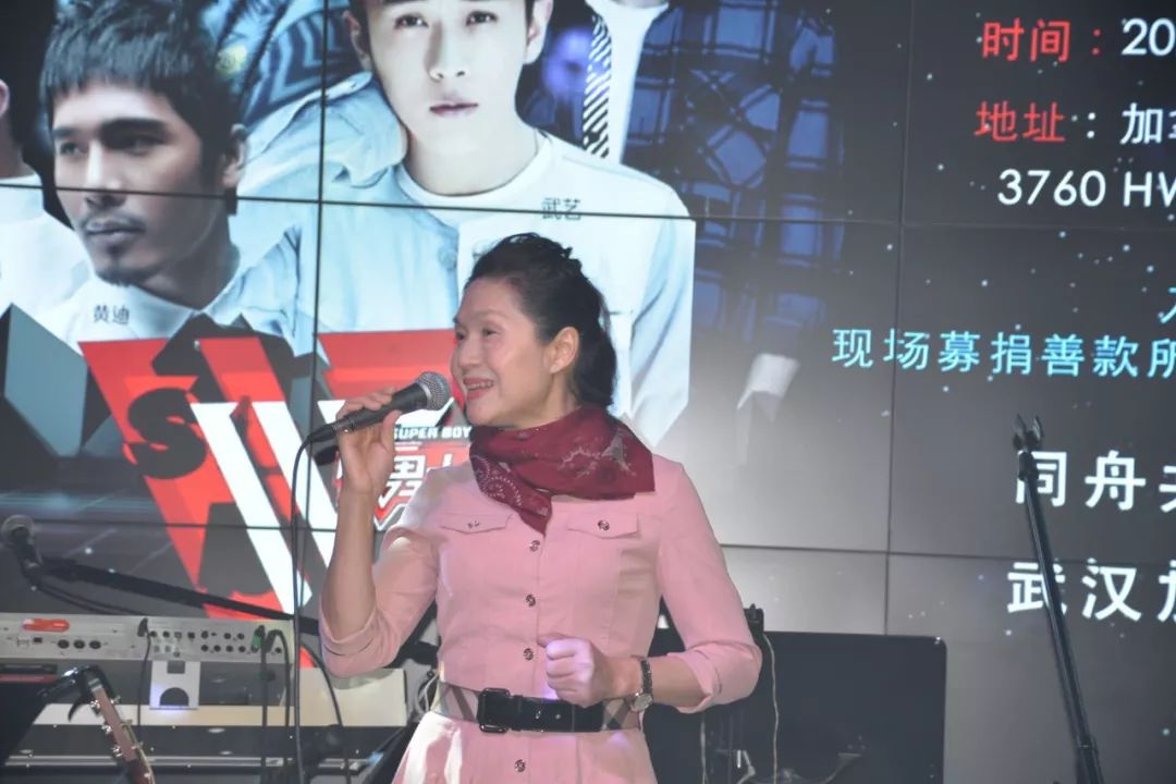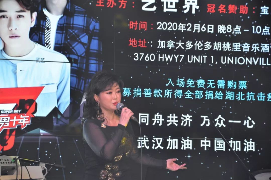 在众人期待的当晚压轴演出快男武艺之前,主持人秦屹让大家轻松一下,请出了武艺妈妈莎莎,一是因为当晚有粉丝是为莎莎而来,由于频频登上湖南卫视《我家那小子》节目,让莎莎成为了快男明星妈妈;二是作为这次快男多伦多演出之行的组织者,莎莎登台一席话说出了作为家长看着快男十年成长的感慨,称赞了快男歌手们的才华与实力,对到场支持义演的朋友们也表达了诚挚的谢意,同时也说出了组织本场义演支援武汉的发心,又献唱一曲《爱在天地间》,优美温情的歌声唱出了本场晚会的声音:爱的呼唤让我们在一起,走过风风雨雨。接着,莎莎又邀请了本次义演的特别支持者加中科教文协会会长刘莹上台演唱,她以一曲深情婉转的《望月》表达对家乡对同胞的思念与关切,表达对疫情第一线白衣天使的赞美,她们是比月亮更美的人!