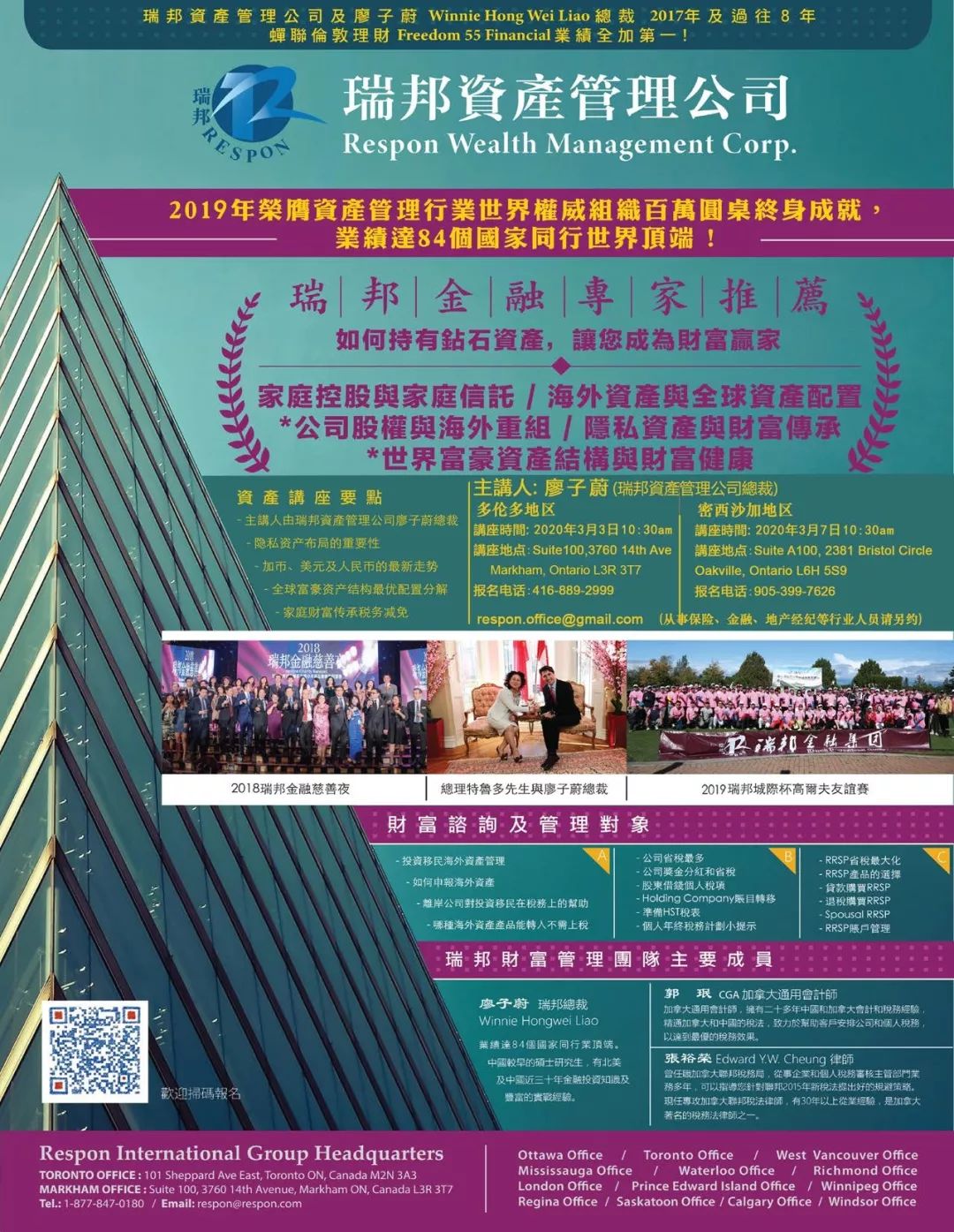瑞邦金融成立于2001年,在全加有近十个分公司。近二十年来,硕果累累,业绩达84个国家同行榜首,廖子蔚总裁2019年荣获资产管理行业世界权威组织百万圆桌终身会员。