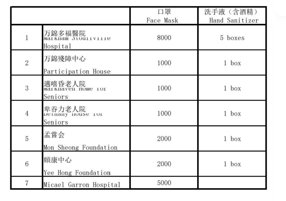 加中资讯网2020年4月18日讯,加拿大上海商会响应万锦市市长Frank Scarpitti 薛家平和Alan Ho 何胡景议员号召,在最短时间里筹集了20000只口罩和10箱洗手液,於4月15捐赠给在万錦市急需醫療物資捐贈的機構: