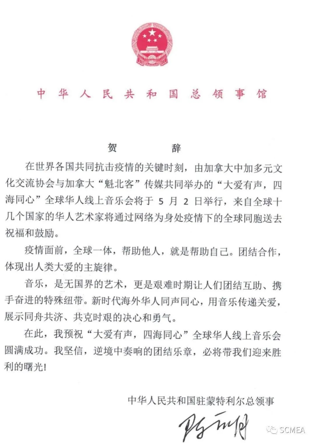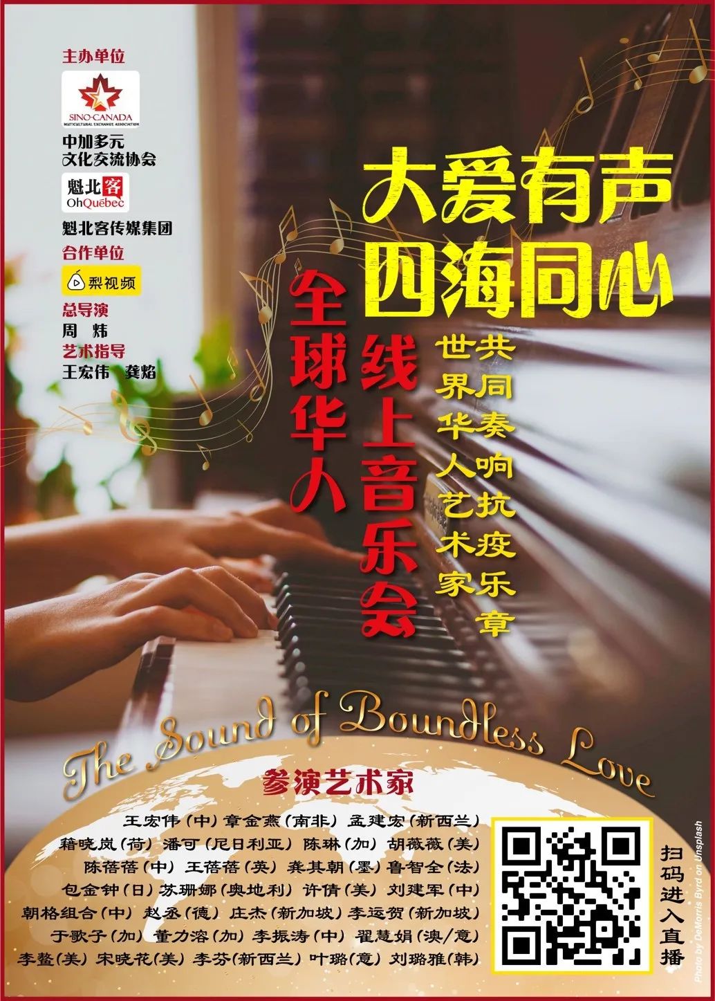 在世界各地共同抗击“COVID-19”疫情的关键时刻,由加拿大中加多元文化交流协会与加拿大“魁北客”传媒集团、中国华侨国际文化交流促进会、“北美南开之声”融媒体集团、南开蒙特利尔校友会共同主办的“大爱有声,四海同心”全球华人线上音乐会5月2日面向全球进行了线上直播。