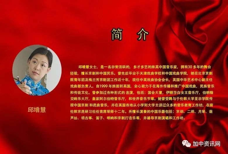 中英戏曲协会会长、旅英中国音乐家邱增慧女士也率领团队参加了演唱,邱女士还为晚会献演了一曲京胡独奏