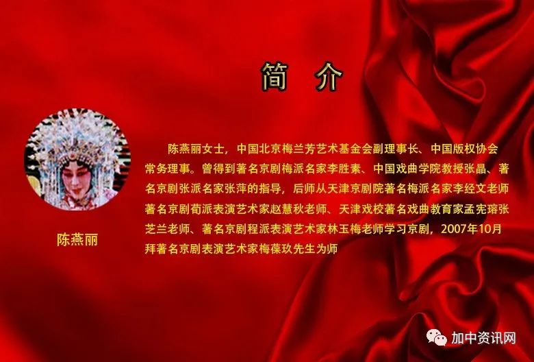 中国北京梅兰芳艺术基金会副理事长、中国版权协会常务理事,著名京剧表演艺术家梅葆玖先生的入室弟子陈燕丽为晚会献演了一曲梅派代表剧《西施》响屧廊一段“水殿风来秋气紧”