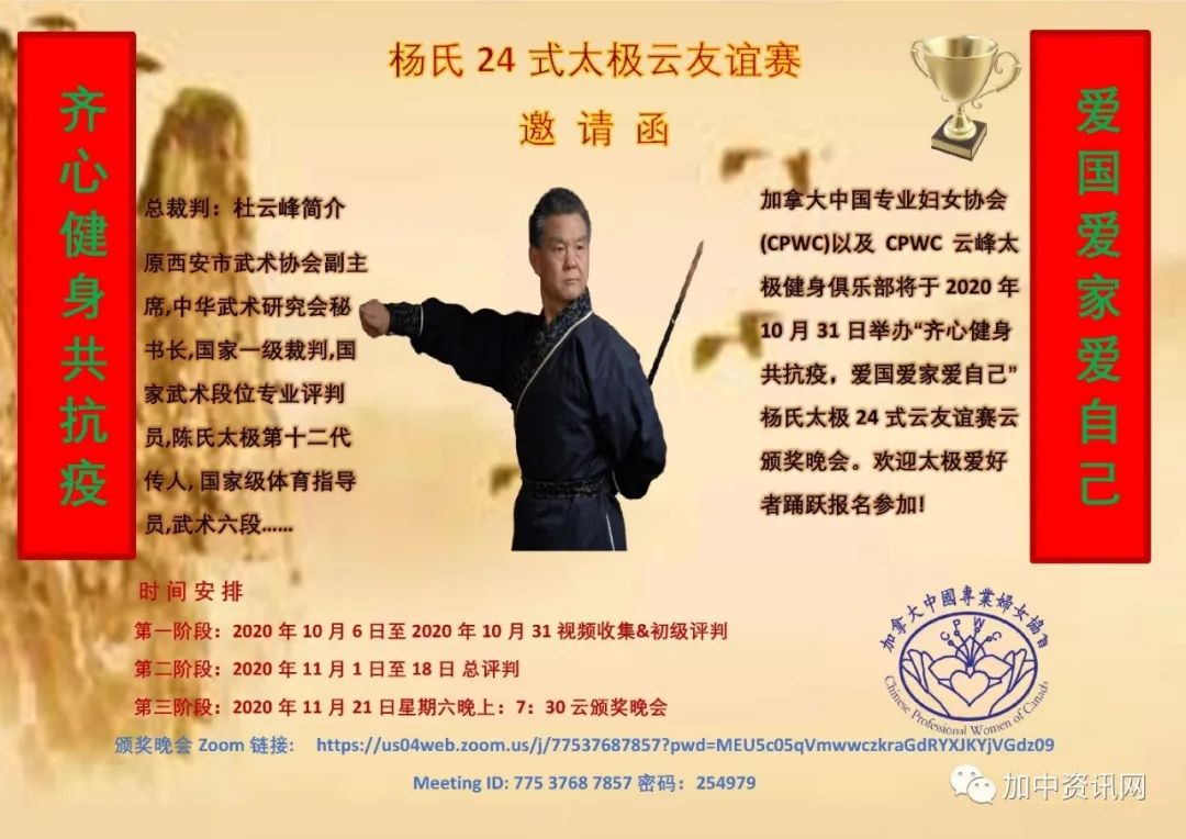 自疫情发生以来,加拿大中国专业妇女协会第一时间联系到了多伦多社区有名的太极前辈杜云峰师傅,创办了CPWC线上太极健身俱乐部进行线上教学,鼓励同胞们积极健身,抵抗疫情。