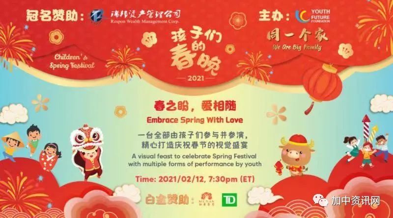 由“青少年未来发展基金会”举办,“瑞邦金融”冠名赞助,牡丹集团和TD银行大力支持的2021年《孩子们的春晚》将在新春农历新年这晚,与大家不见不散,2021年2月12日 ,我们期待“云端”相见,共同度过一段美好的时光!