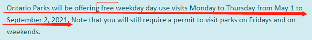 从5月1日到9月2日,每一个周一、周二、周三和周四,安省公园局(Onatrio Parks),全都提供免费门票!