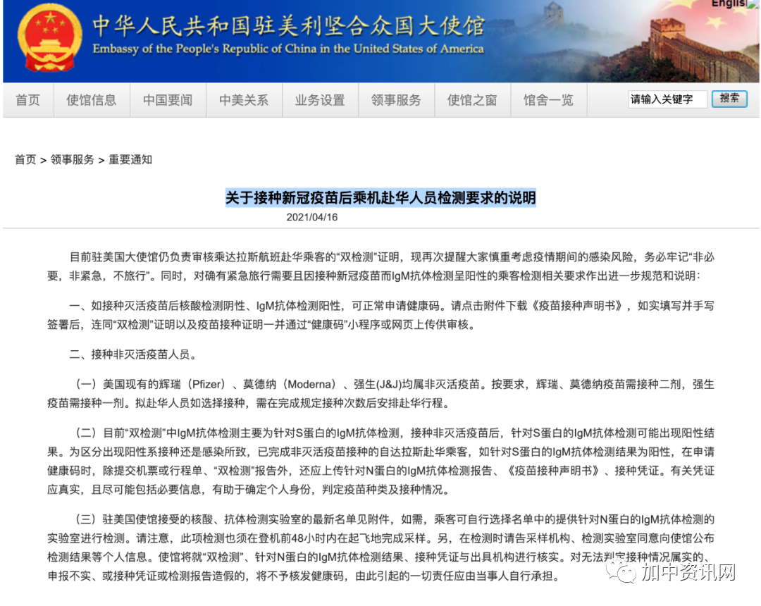 加中资讯网2021年4月22日讯,就在上周,中国驻美国大使馆发布消息,接种海外疫苗的华人可以回国,但须提供针对N蛋白的血清IgM抗体检测报告。