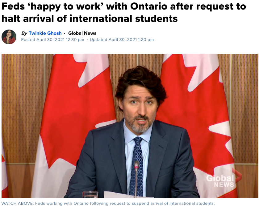 对于安省省长福特的请求,加拿大总理特鲁多今天做出迅速回应表示,加拿大联邦非常高兴与安省配合,中止国际留学生入境安省。