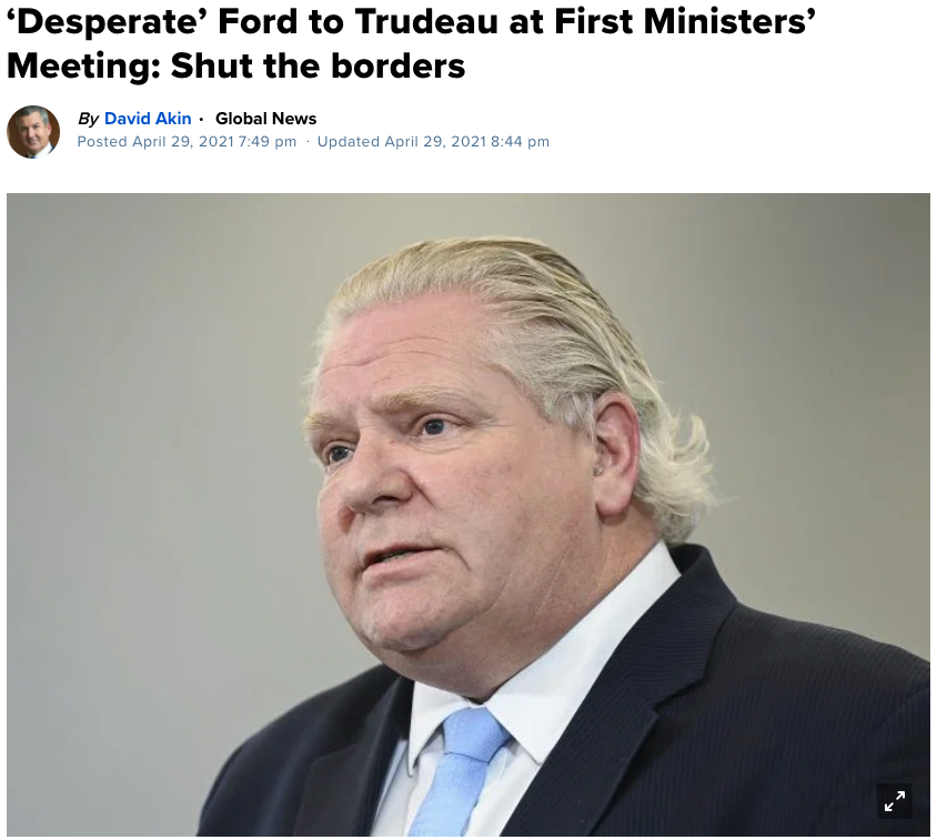 “在过去的两周中,超过15万人(不包括必需的商业卡车司机)越过了加拿大的陆地边界。其中于2021年4月24日-26日3天就有数十人从目前禁止直飞加拿大的国家出发,绕道美国进入加拿大,这不仅是安省的问题,而且是整个加拿大的问题。”