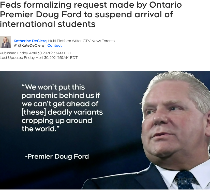 道格·福特省长已请求联邦政府暂停国际留学生的到来,以减缓COVID-19的传播。