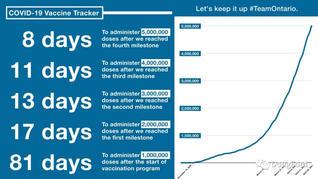 安省省长福特今日(4月30日)表示:“迄今为止,省府已经施打了超过500万剂疫苗。也在此感谢全体安省团队(Team Ontario)成员,正是你们的辛勤努力,让我们走到了今天这一步。我们将在今天结束前,为全省40%成年人口接种疫苗。”