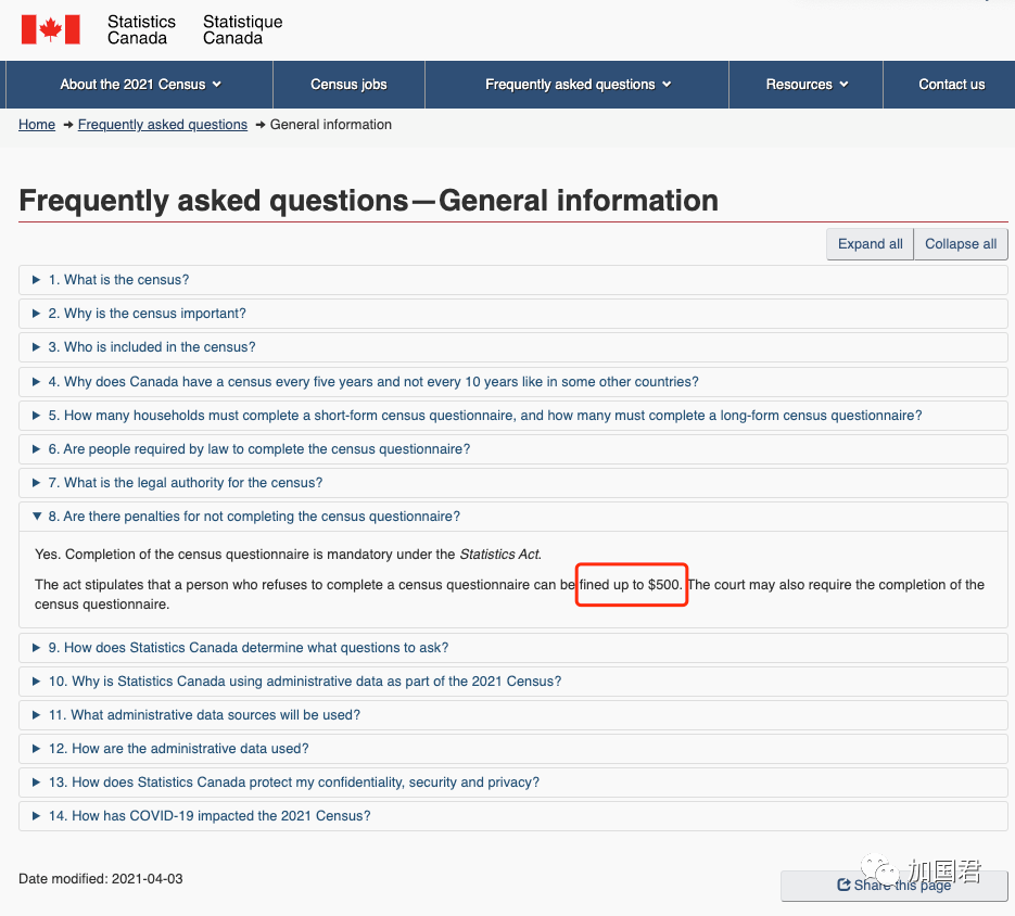 加拿大统计局4月3日在网上答疑表示,如果拒绝接受人口普查,将会被罚款高达500加元。