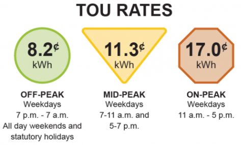 在“分时计费”系统中,从5月1日开始,高峰时间的价格为每千瓦时$17.0分,中峰时段为每千瓦时$11.3分,非高峰则为每千瓦时$8.2分。
