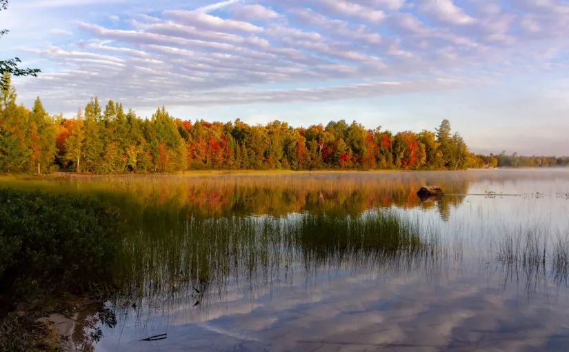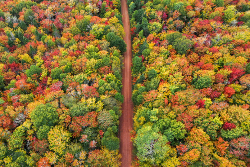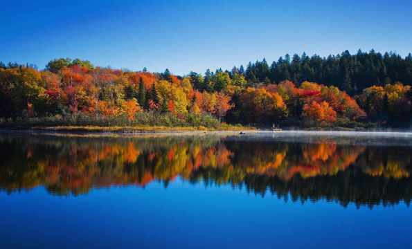 最佳观赏点:在阿岗昆公园里,沿着60号高速走廊,可以看到丰富的枫叶颜色变化。公园西侧的树枝上呈现出了最好的色彩。朝南向阳一面,要比其他区域有更明显的颜色变化,比如在树林下面的大部分叶子,仍然是绿色的。枫树的红色和橙色正是闪亮的时候,桦树和白杨刚刚开始变黄,而塔马拉克树还保持着绿色。在近日的大风和大雨过后,有些树叶已经落下,但大部分仍然留在树上。