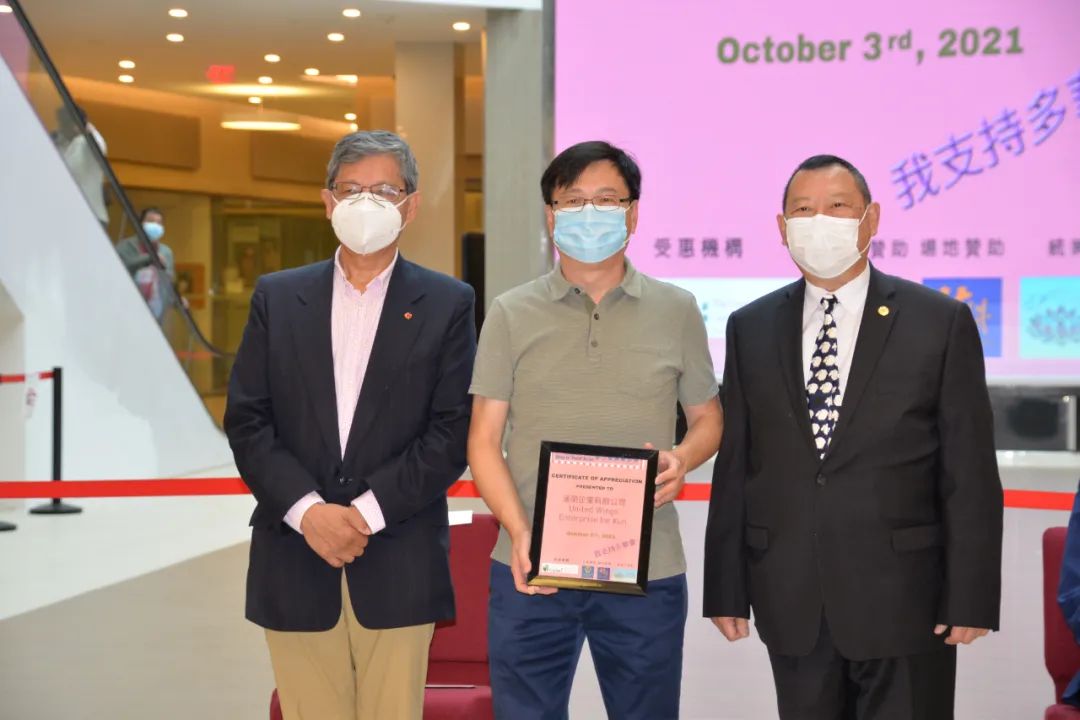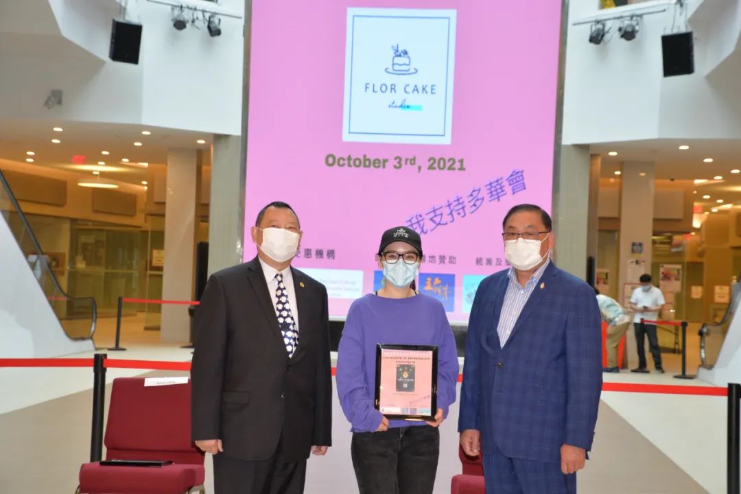 “朗逸花园”捐赠支票的代表Victor Xie(左),David Chen(右),中为多华会会长郑永麟