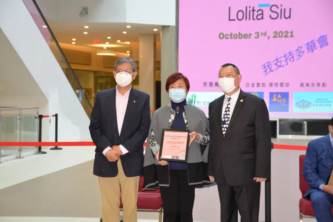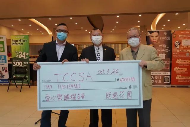 由朗逸花园代表Victor Xie 和 David Chen 致送$1000 支票给多华会,由多华会会长郑永麟(Nelson Cheng )代表接收。