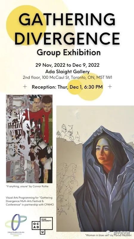 2022年11月29日,安大略省艺术运动中的文化多元主义(CPAMO)与安大略省艺术与设计学院大学合作举行的2022 年秋季多元艺术节在多伦多启动。其中“集多元性”艺术群展(Gathering Divergence Group Exhibition)便是艺术节的一大亮点。艺术节活动由策展人艾琳索娃(Ilene Sova)和姚瑞珊(Madge Yao)共同策划。“集多元性”艺术群展展址在安大略艺术与设计学院大学(OCAD)主楼二楼艾达·斯莱特画廊(Ada Slaight Gallery),展期为2022年11月29日至12月9日,共10天。
