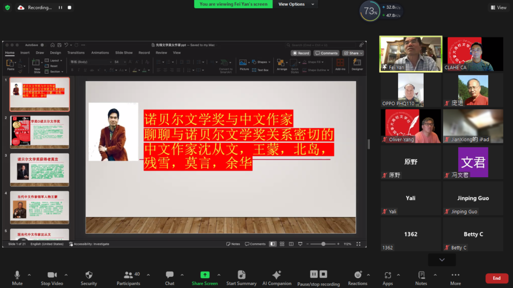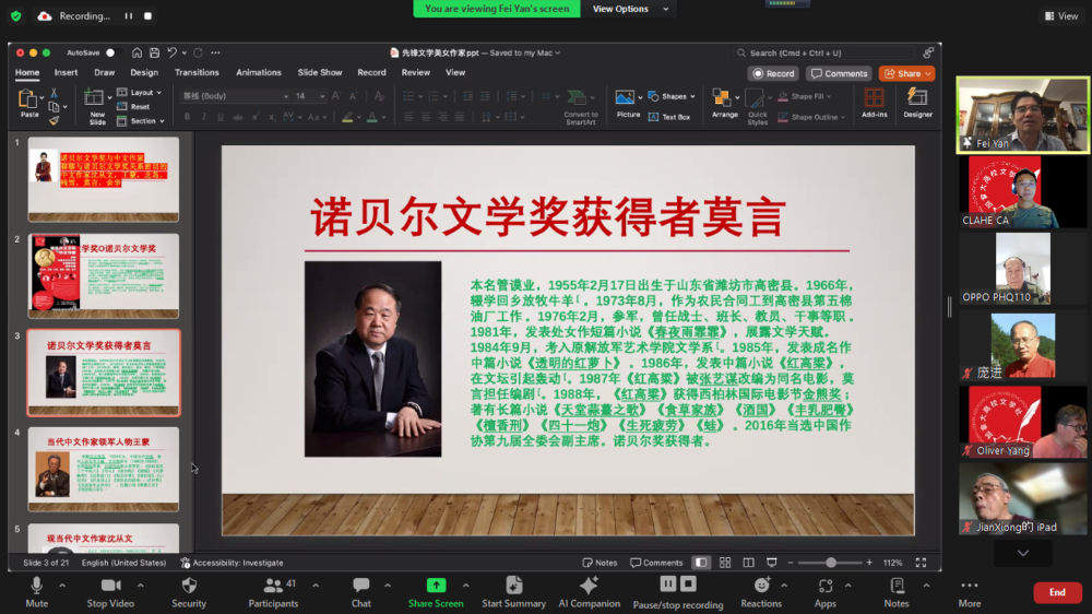 2024年6月29日,应加拿大高校文学社邀请,加拿大中文作家协会会长、作家燕飞(燕大侠)做客加拿大高校文学社线上文学主题讲座,漫聊诺贝尔文学奖与中文作家。线上讲座由高校文学社常务理事陈刚主持,社长原野(杨海军)出席讲座并做开场致辞。