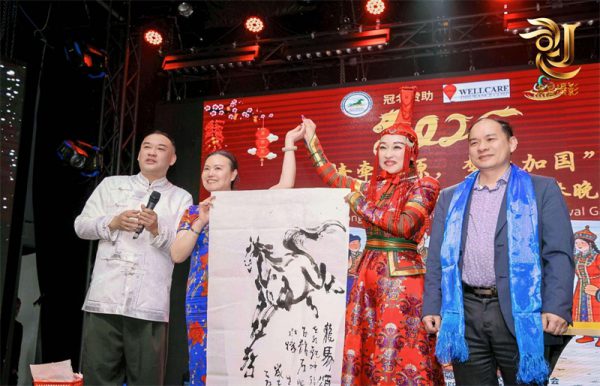 晚会期间各种奖抽不停,人人有奖。包括汾酒、Signature Cosmetic Clinic 贵重化妆品、江西同乡会黄岚会长赠送的景泰蓝瓷瓶,河北同乡会李贺曾会长赠送的泸州老窖以及项链,名牌皮带、蓝牙灯箱、西域食府打折卡、祥德斋折扣券、电饭煲等和现金大奖$666。为现场观众带来无限惊喜与欢乐。中国著名书画家余岸声现场挥毫创作骏马图《龙马颂》并作为新春贺礼隆重赠送内蒙古协会,为晚会增添浓厚的艺术气息。